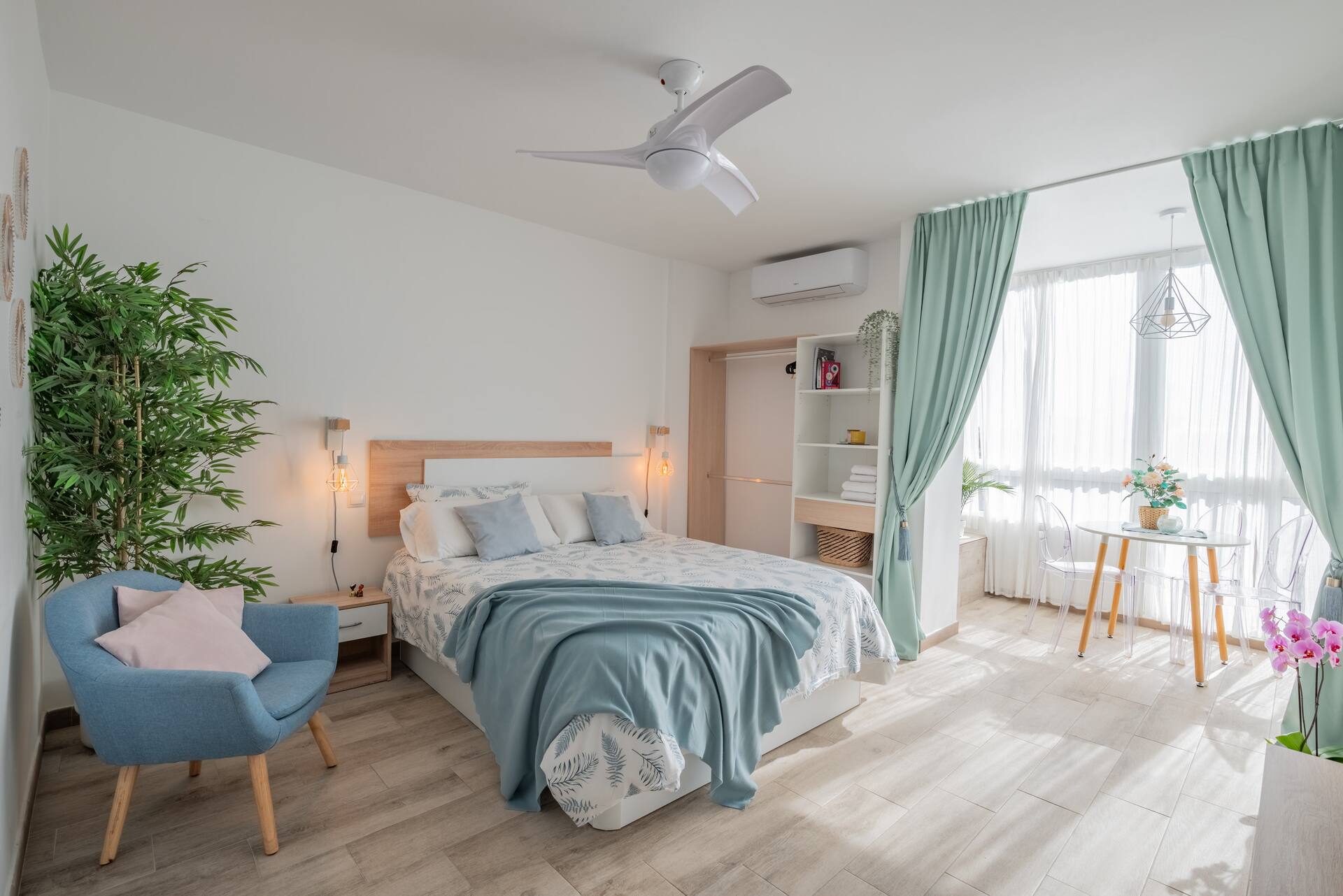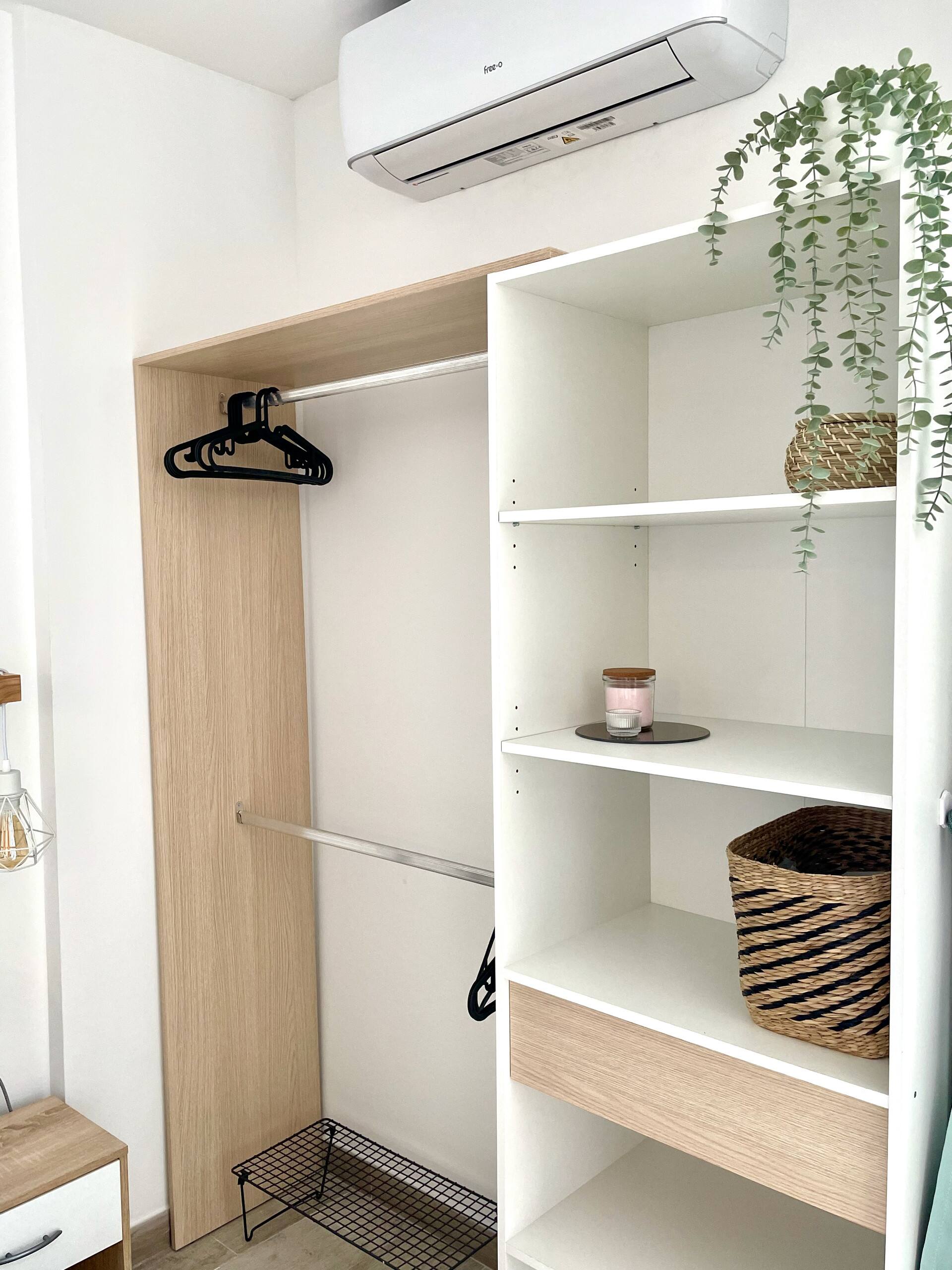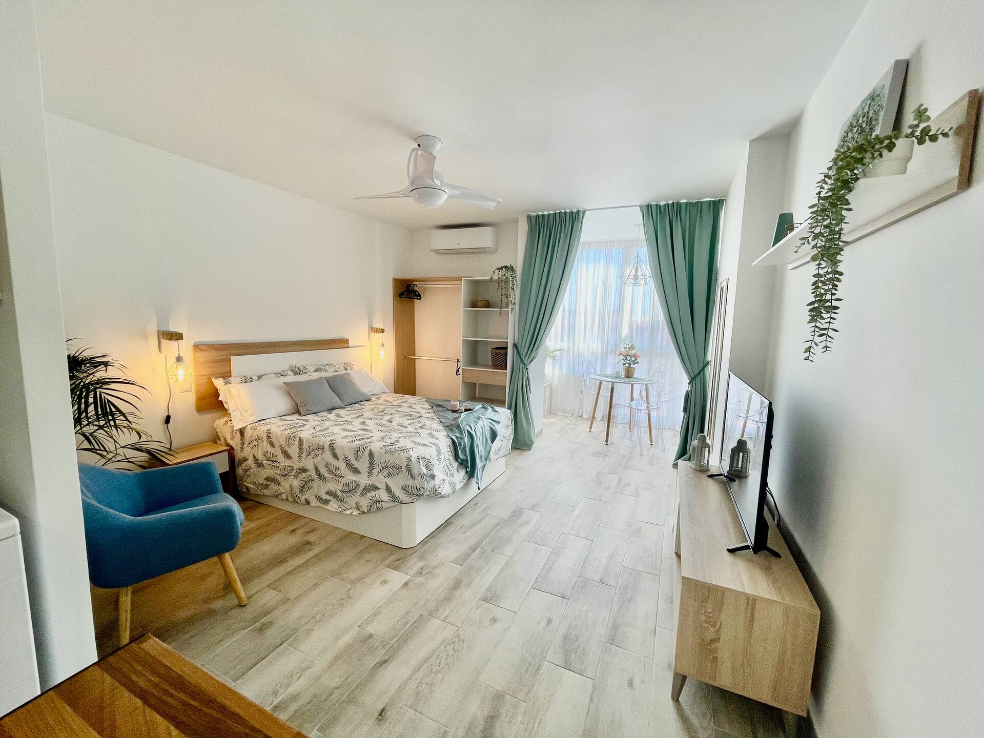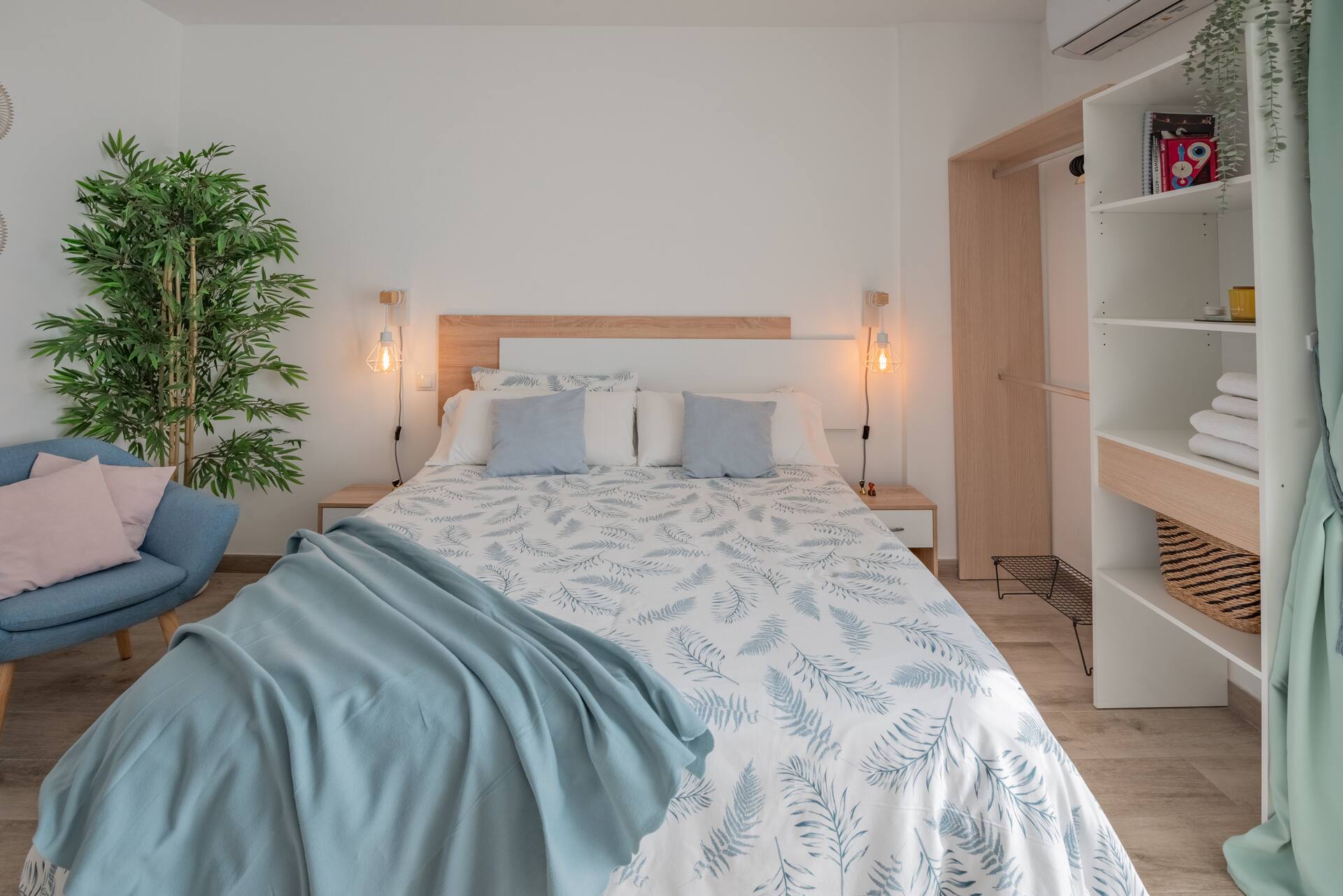 El estudio cuenta con una cómoda cama de 1,50 m de ancho y un vestidor abierto para ropa y objetos personales. Smart TV y wifi gratuito.