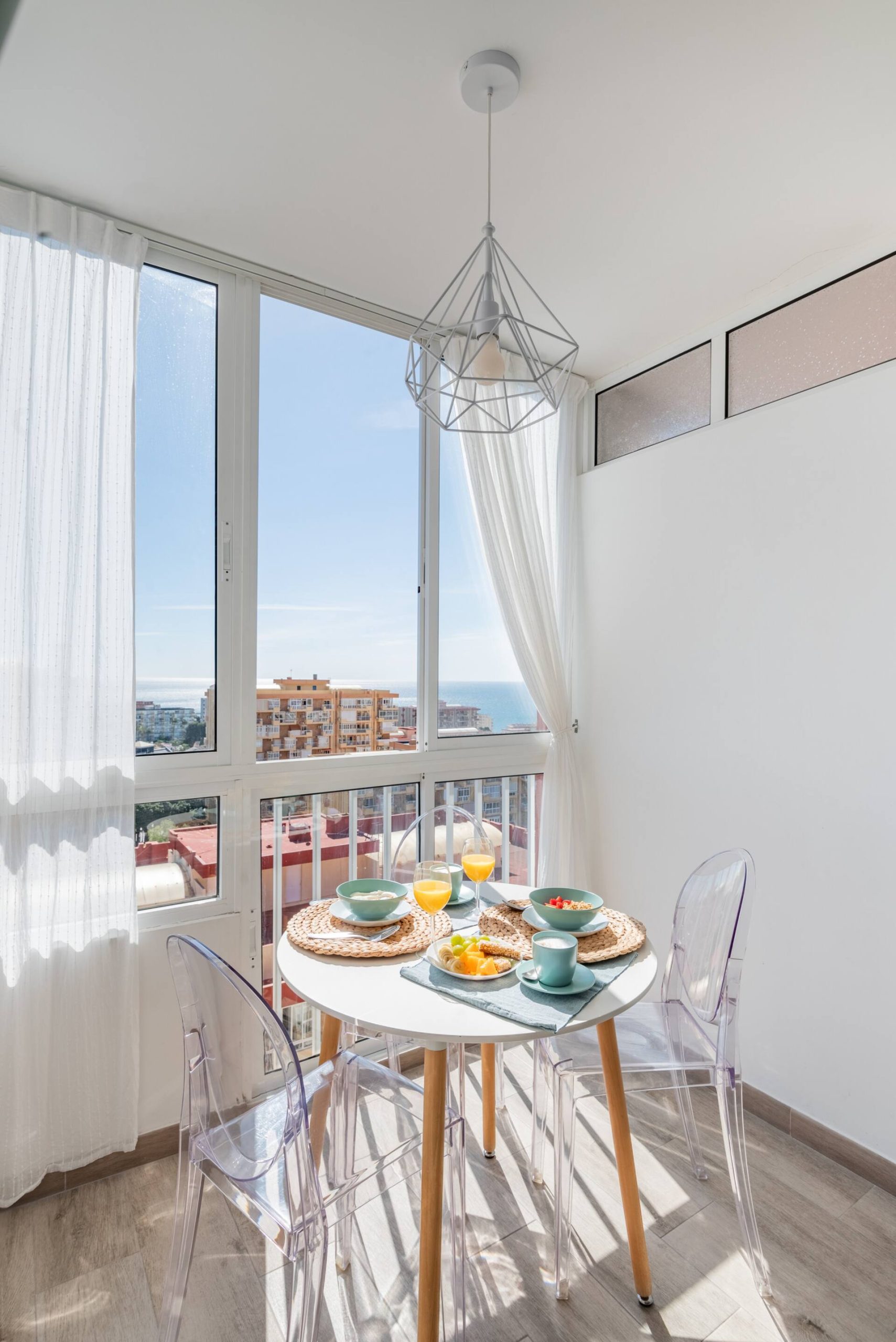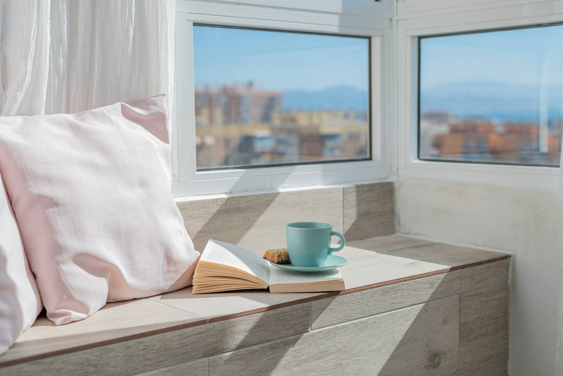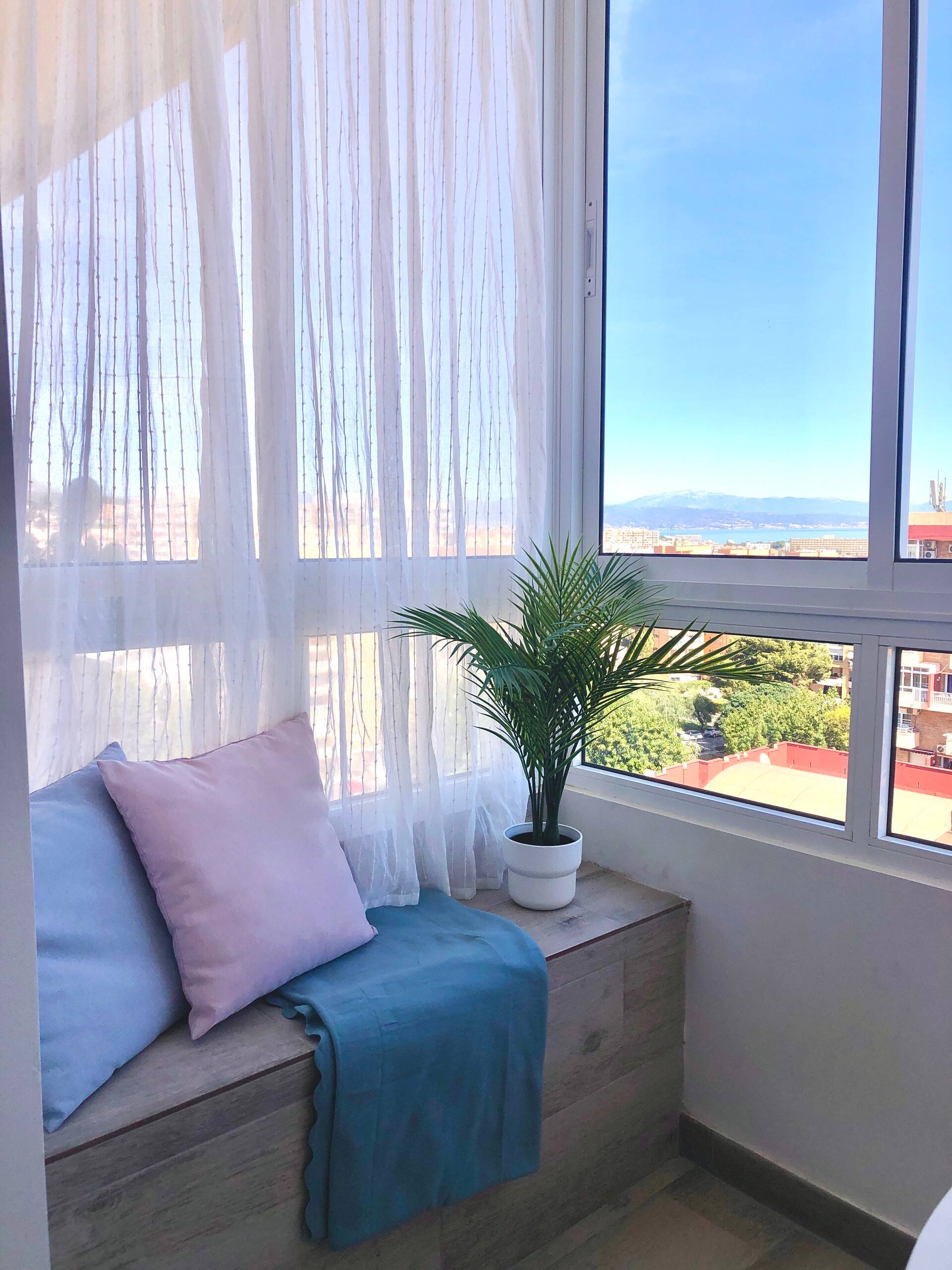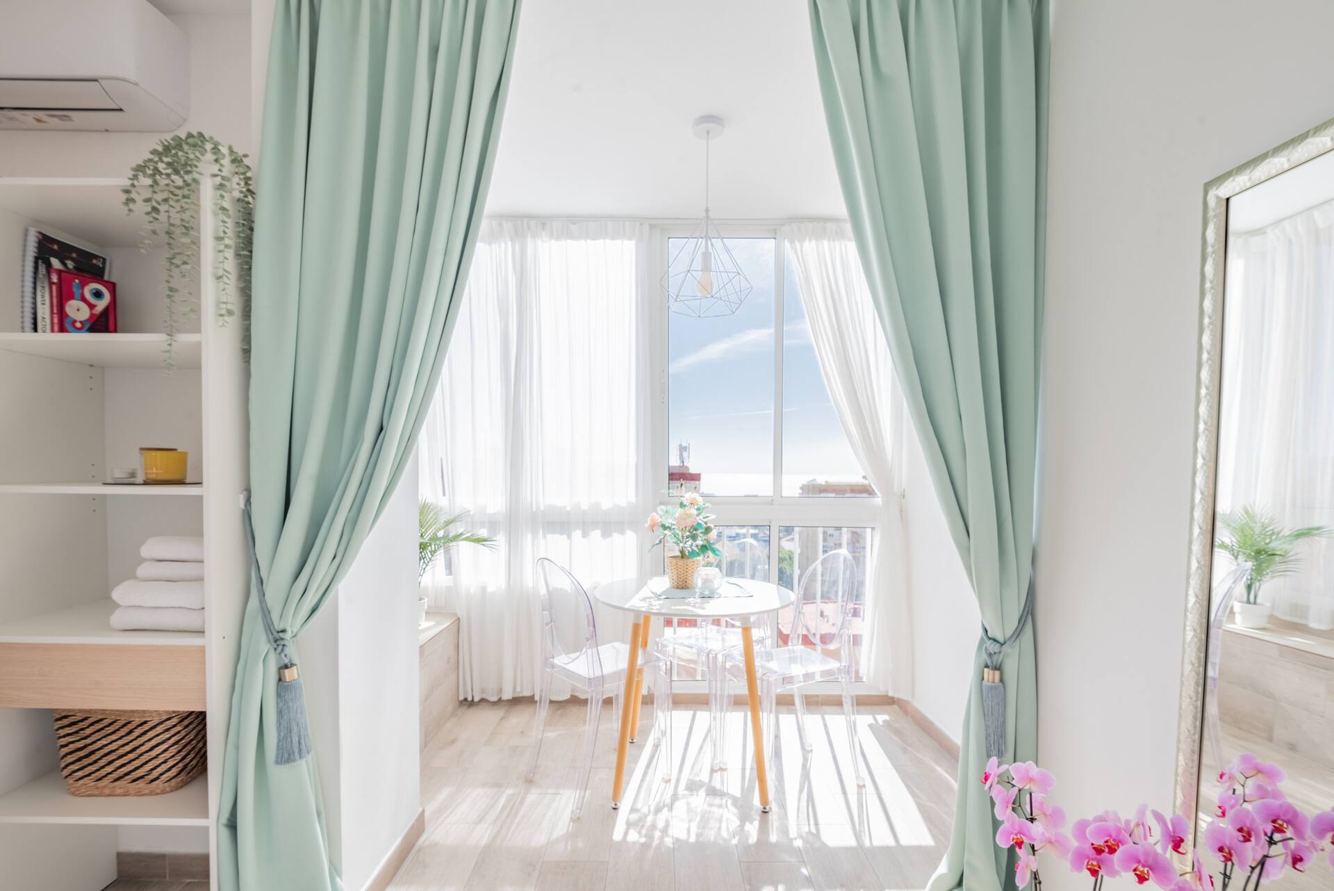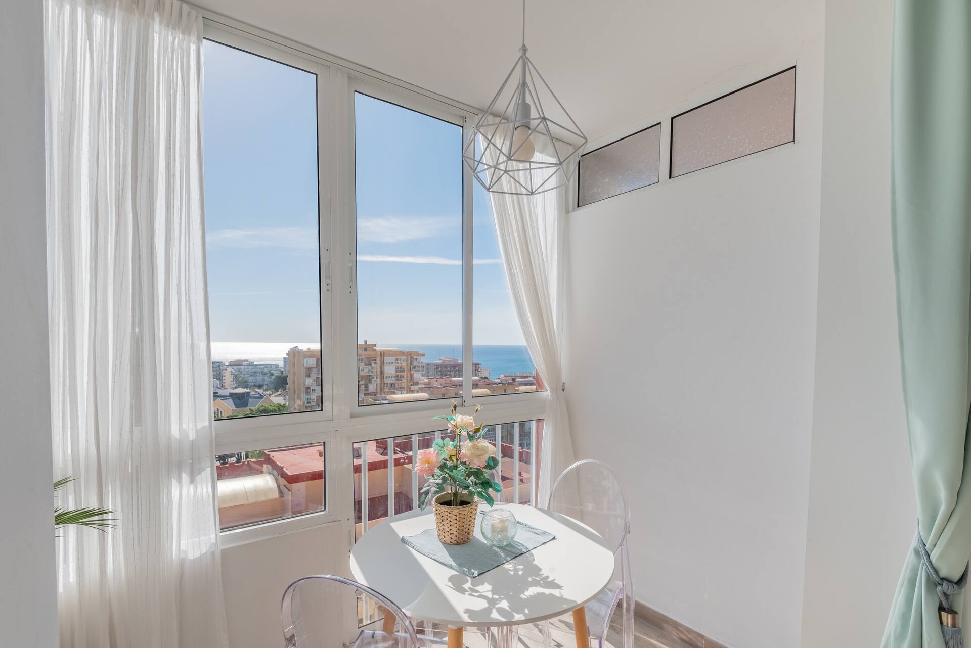 Balcón cerrado, donde se encuentra el espacio comedor para disfrutar de buenas vistas y un cielo luminoso. La propiedad tiene orientación este, por lo que recibe el sol de la mañana y eso la hace muy agradable y luminosa. También cuenta con cortinas black out para un buen descanso.